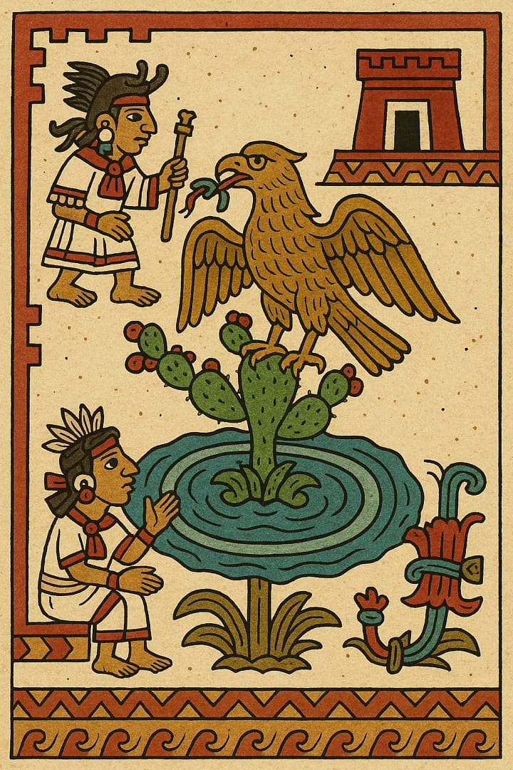 Uno de los íconos más potentes de la fundación mexica es el águila posada sobre un tunal, que no se encuentra simplemente sobre tierra, sino enraizada en un ojo de agua, un detalle presente en varios códices y frecuentemente ignorado. Este ojo de agua está ligado al dios Tláloc y representa la unión de los elementos agrícola y bélico, base de la cosmovisión mexica.