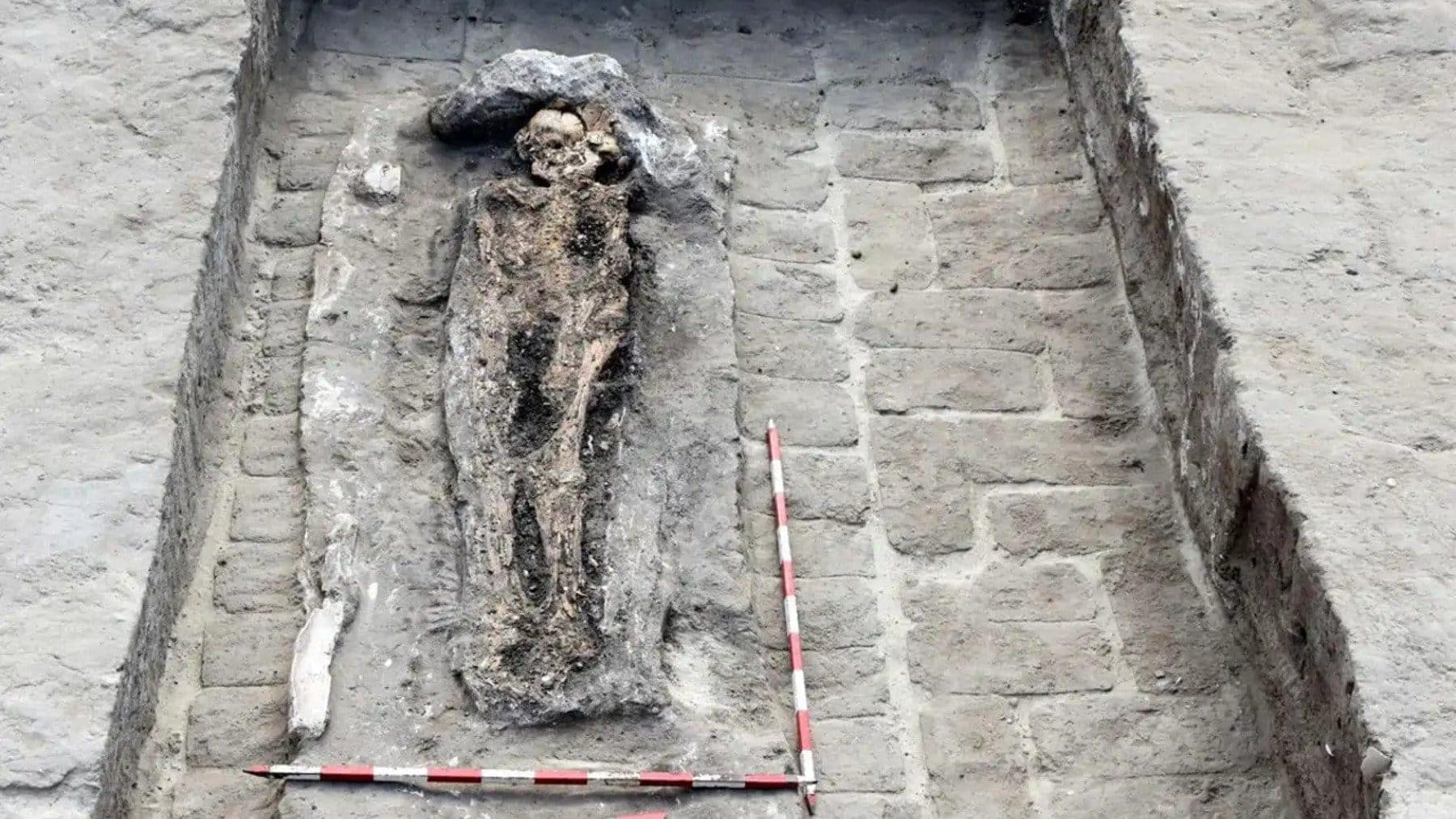 El esqueleto hallado estaba envuelto en cartonaje, una técnica funeraria que empleaba lino y yeso, usada habitualmente en enterramientos posteriores.