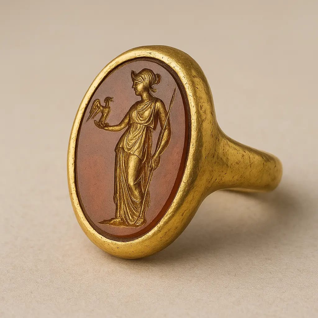 Este anillo no es solo una joya antigua, sino una pieza excepcional en términos históricos y estéticos. Está confeccionado en oro y presenta un intaglio tallado en una piedra semipreciosa que representa a Venus Victrix, la diosa romana de la victoria.