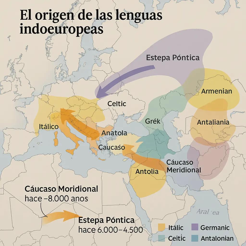 1. Primera expansión (hace ~8.000 años): desde el sur del Cáucaso, hacia Anatolia y posiblemente Grecia y Albania. Aquí nacieron ramas como la hitita, griega y albanesa. Estas lenguas no muestran señales genéticas esteparias.