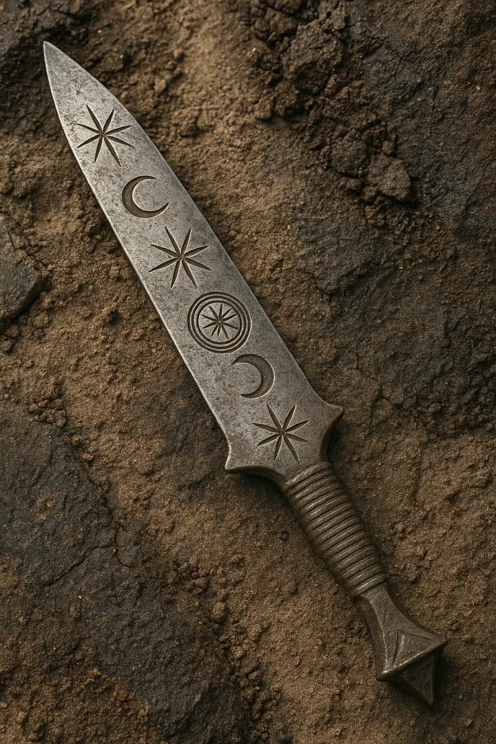 La daga mide aproximadamente 24 centímetros y presenta una hoja ornamentada con símbolos astrales: cruces estrelladas, lunas y lo que parece un mapa celeste. El mango, igualmente decorado, es estrecho y puntiagudo, con anillos tallados y grabados geométricos.